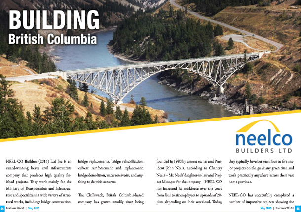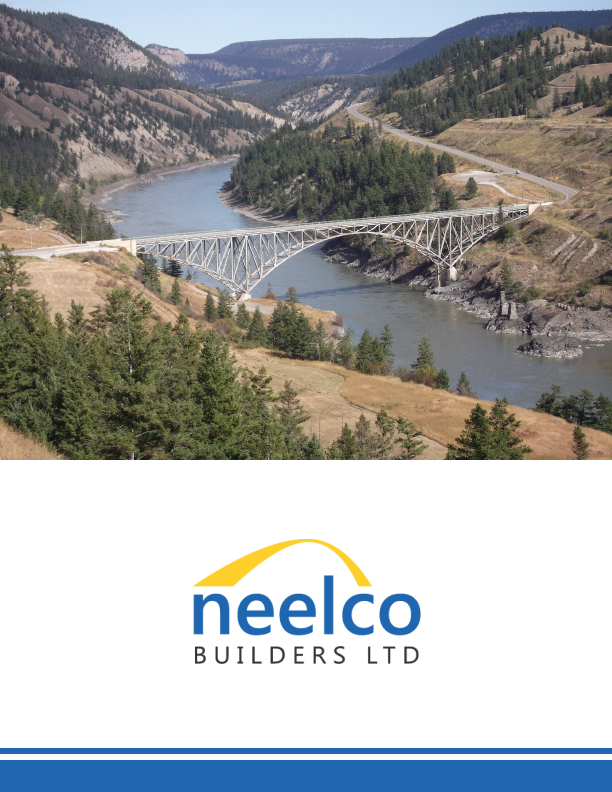 NEEL-CO Builders (2014) Ltd Inc is an award-winning heavy civil infrastructure company that produces high quality finished projects. They work mainly for the Ministry of Transportation and Infrastructure and specialize in a wide variety of structural works, including: bridge construction, bridge replacements, bridge rehabilitation, culvert reinforcement and replacement, bridge demolition, water reservoirs, and anything to do with concrete.